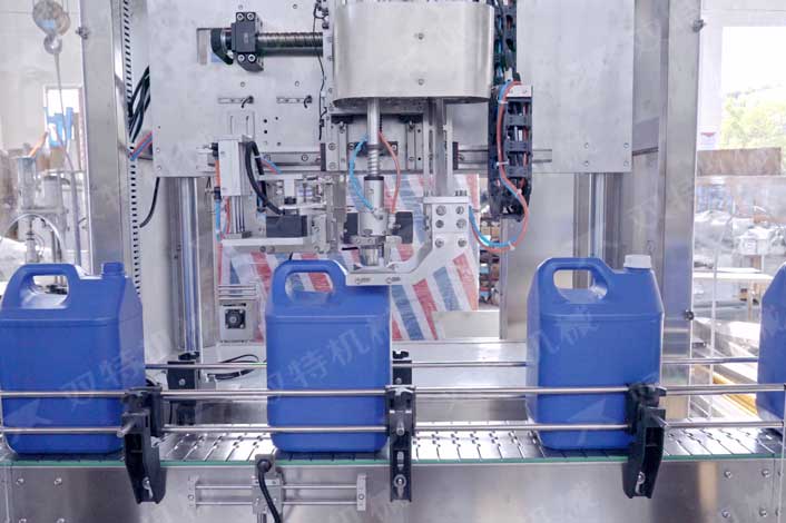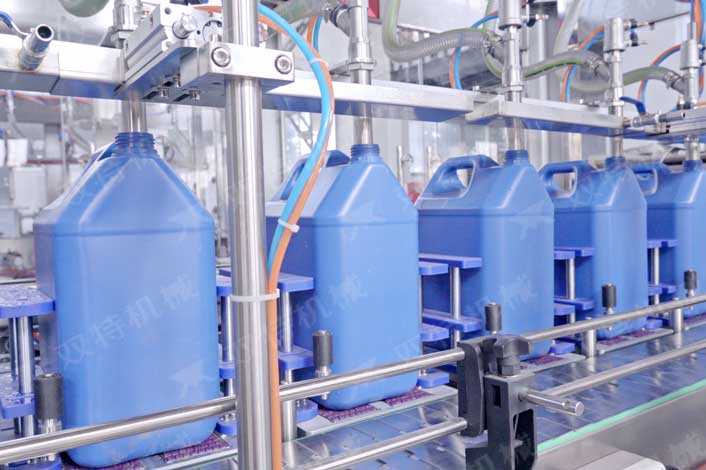 双特机械称重式灌装生产线适用于5-200L的称重计量灌装,自动完成计数进桶、称重计量灌装、自动理盖、跟踪式旋盖机、自动贴标机、喷码机、自动供栈机、码垛机、自动缠膜 等全流程生产。
