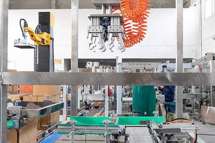 机器人码垛系统主要针对包装线的后道码垛而设计,机器本身占地小,重量轻,功能全面,可以再不同的环境下使用。